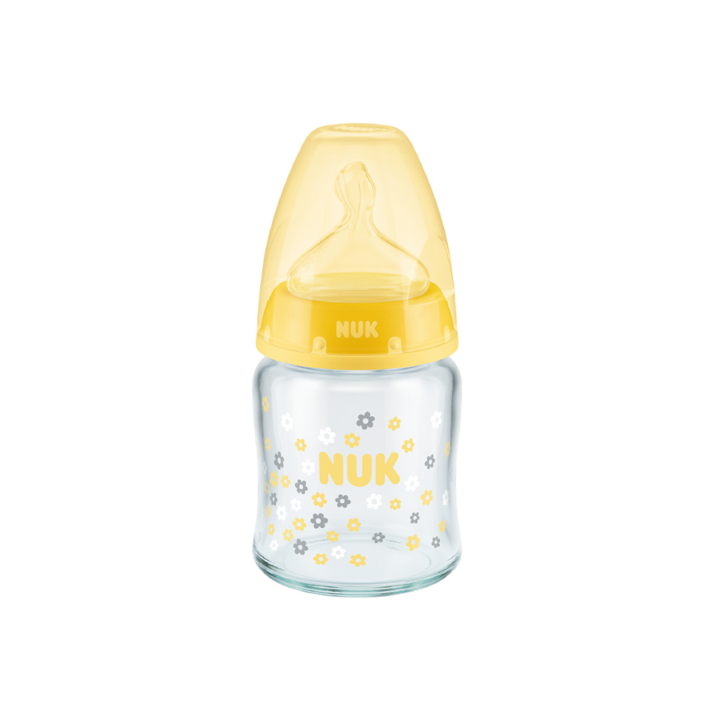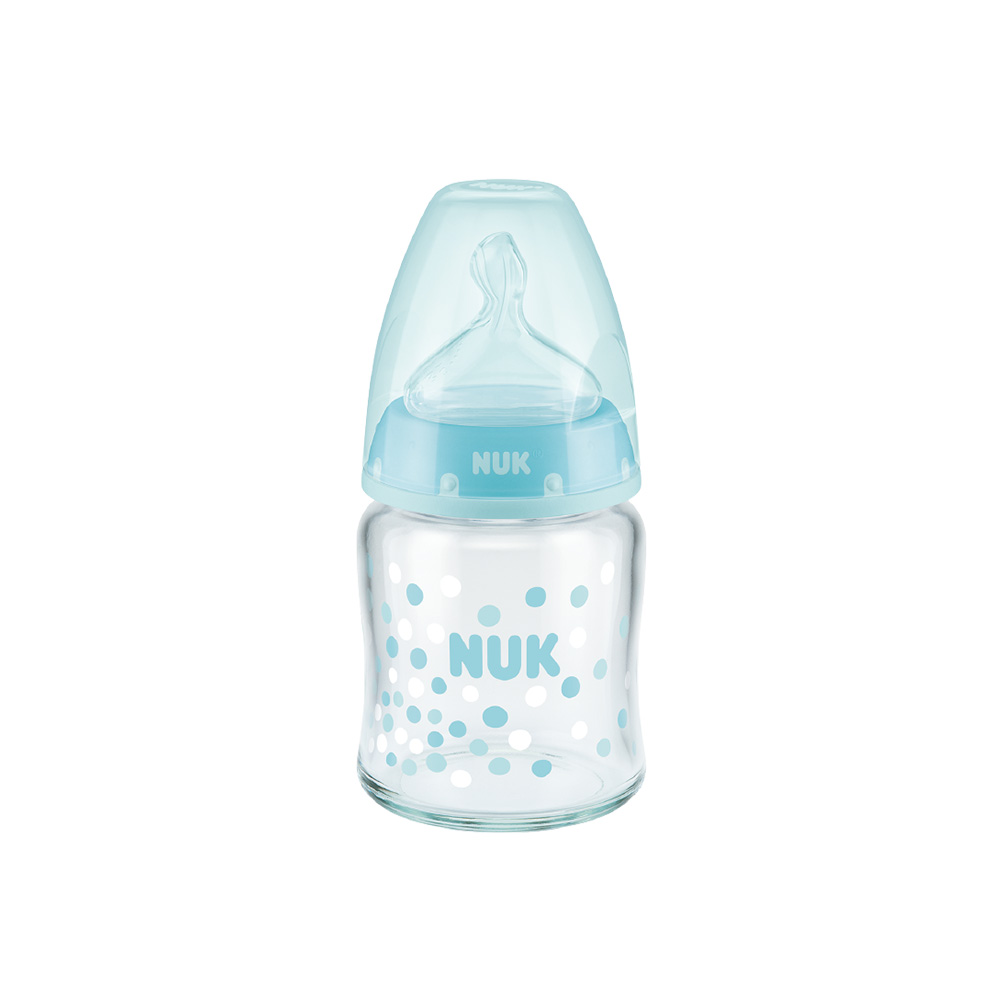 Col large. Biberon en verre. Muni d’une tétine physiologique NUK FIRST CHOICE+ Air System , Anti-colique. Contenance: 120 ml.